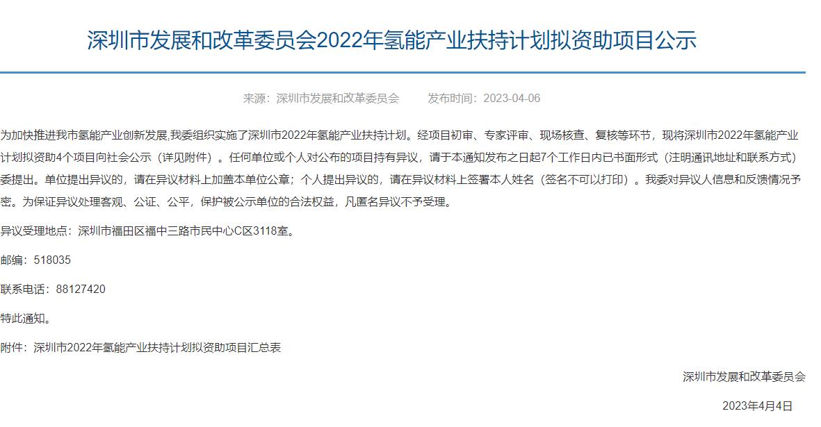 4個項目共資助2500萬元!深圳市公示2022年氫能產業資助項目