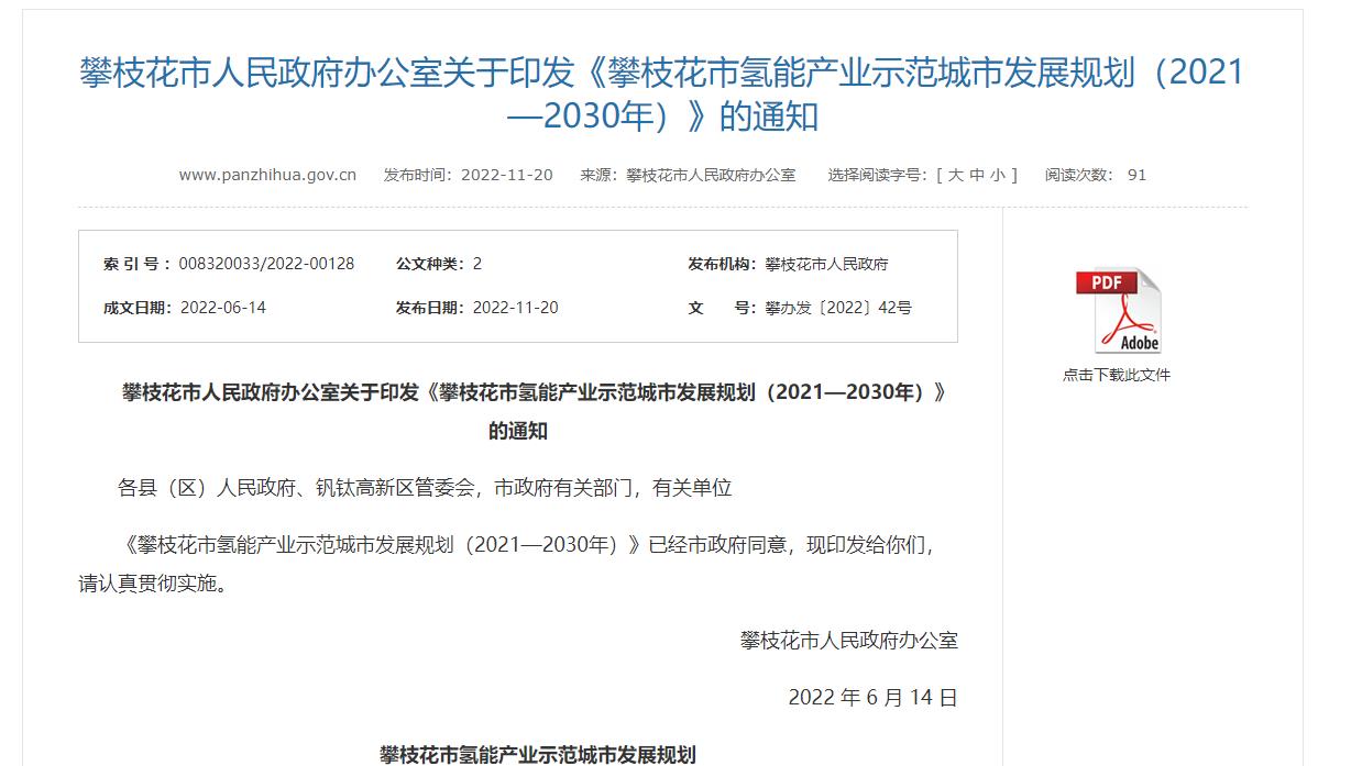 打造“氫能產業示范城市”,攀枝花發布氫能產業示范城市發展規劃(2021-2030年)