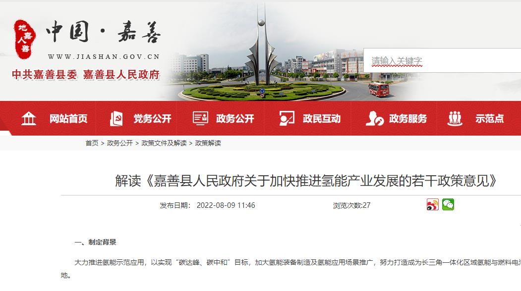 官方解讀:《嘉善縣人民政府關于加快推進氫能產業發展的若干政策意見》(附圖片)