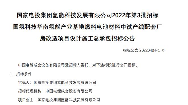 國氫科技華南氫能產業基地燃料電池材料中試產線配套廠房改造項目設計施工總承包招標公告