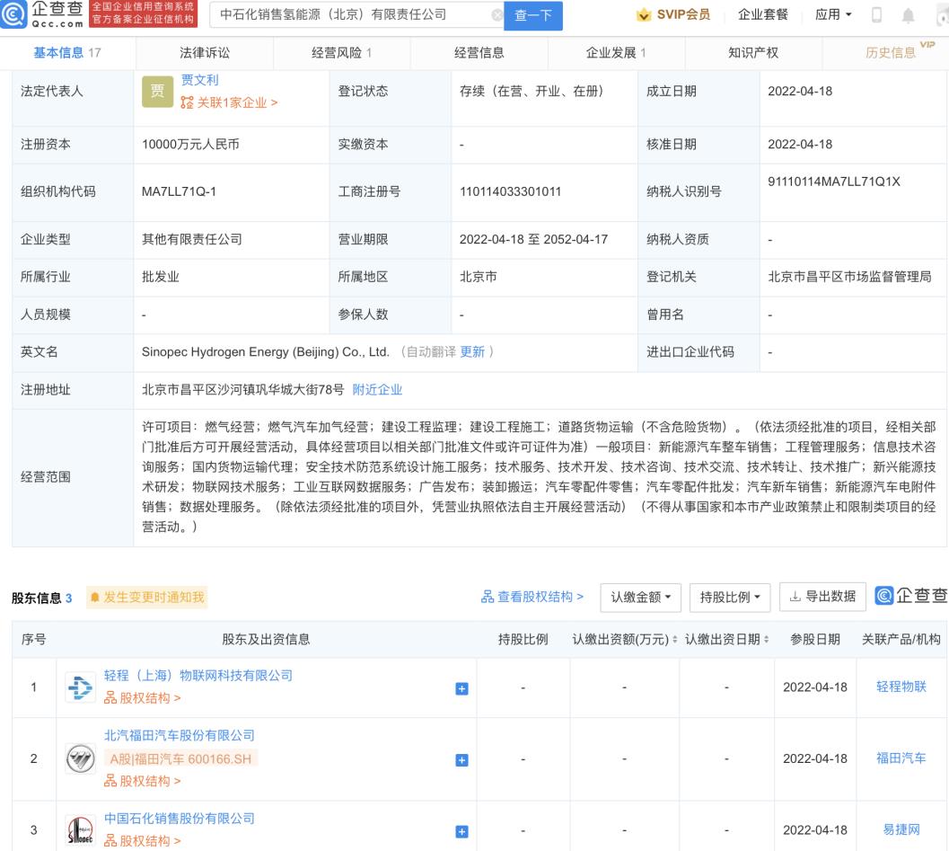 4月20日,北汽福田汽車股份有限公司新增對外投資,新增中石化銷售氫能源(北京)有限責任公司。該公司于2019年成立,法定代表人為劉可飛,注冊資本6109.68萬元。福田汽車于1996年8月28日成立,法定代表人為鞏月瓊,注冊資本為65.75億元。福田汽車對外投資企業共61家,包括北京銀達信融資擔保有限責任公司、山東福田汽車部件制造有限公司等。