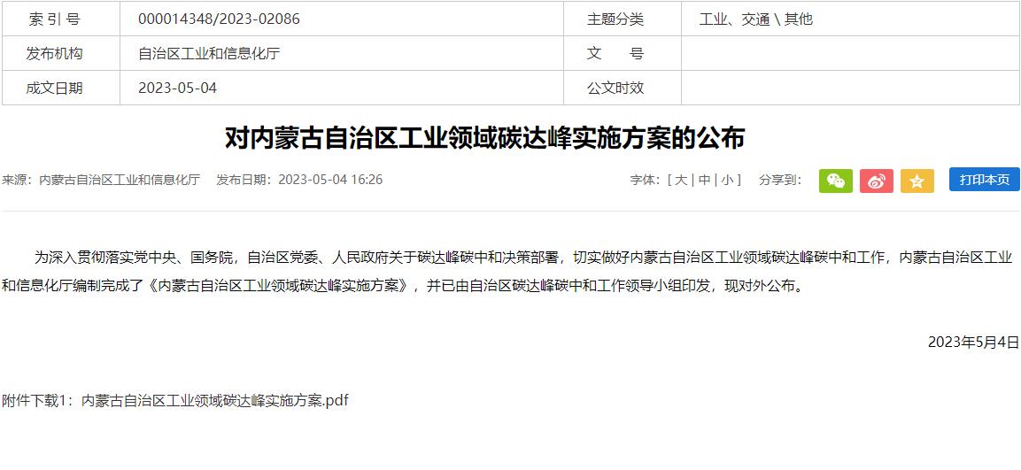 氫啟未來網獲悉,5月4日,為切實做好內蒙古自治區工業領域碳達峰碳中和工作,內蒙古自治區工業和信息化廳公布了《內蒙古自治區工業領域碳達峰實施方案》