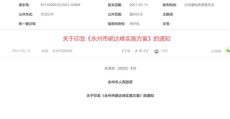 氫啟未來網獲悉,5月15日,永州市發展和改革委員會印發《永州市碳達峰實施方案》