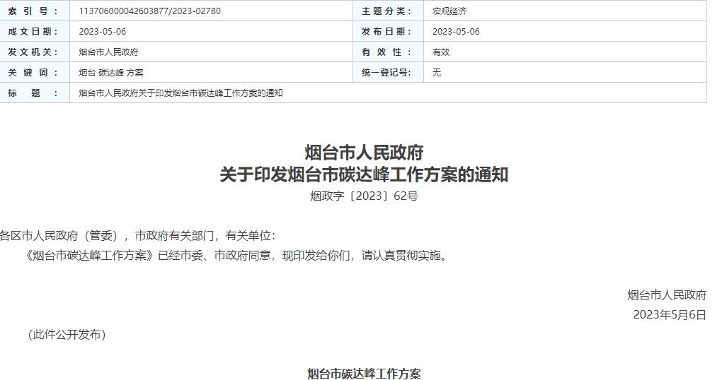 氫啟未來網獲悉,5月6日,煙臺市人民政府發布關于印發《煙臺市碳達峰工作方案》的通知