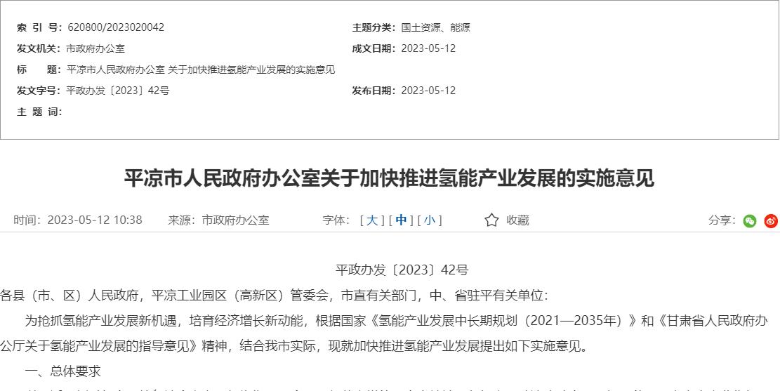 氫啟未來網獲悉,5月12日,平涼市人民政府印發《關于加快氫能產業發展的實施意見》(以下簡稱《方案》)。