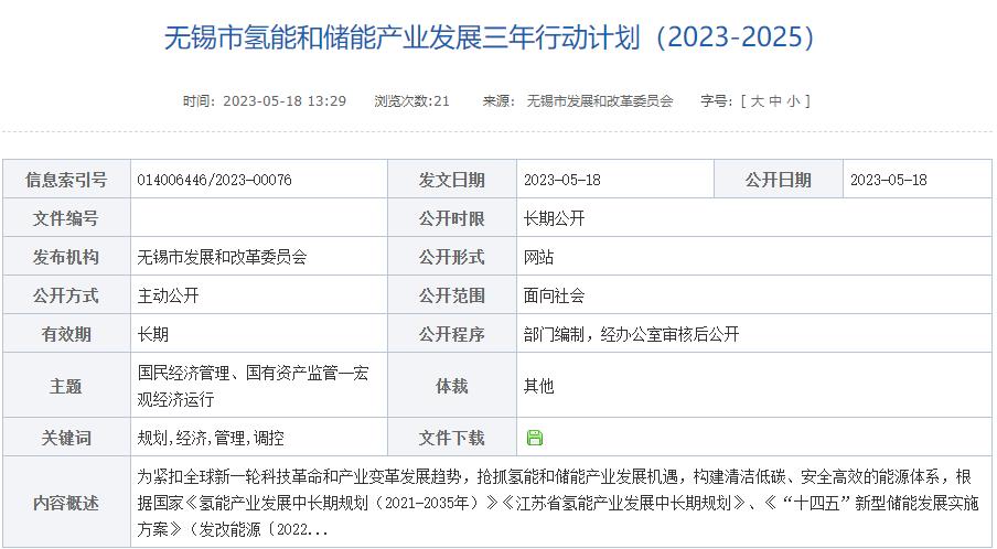 氫啟未來網獲悉,5月18日,無錫市發展和改革委員會發布《無錫市氫能和儲能產業發展三年行動計劃(2023-2025)》