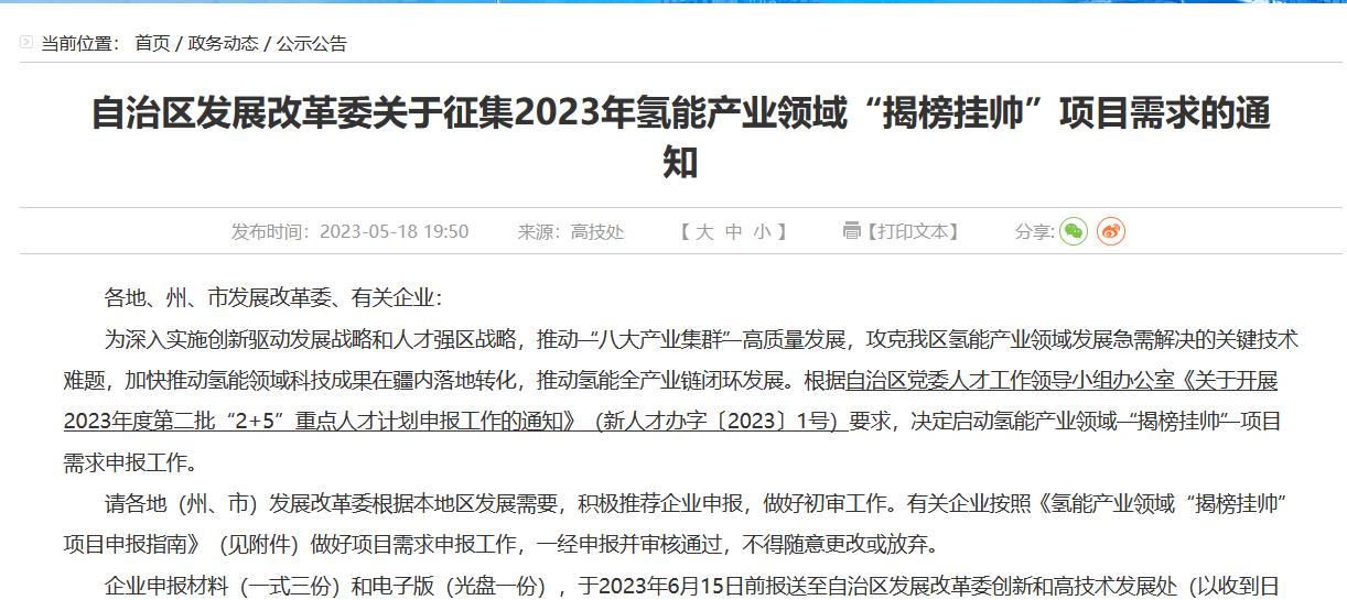 新疆維吾爾自治區啟動氫能產業領域“揭榜掛帥”項目申報