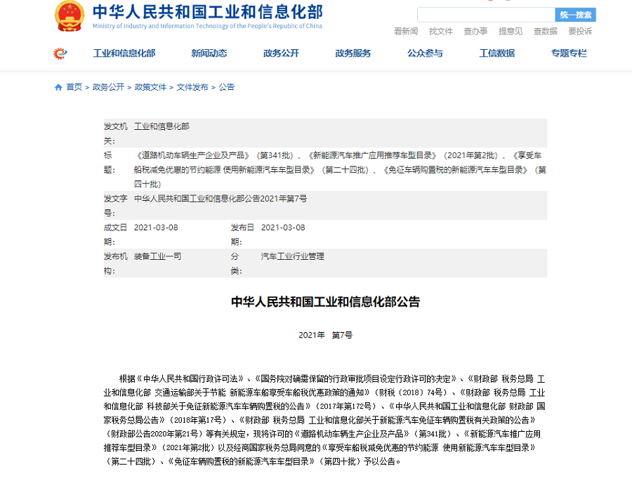 ?3月8日,工信部集中公告了《道路機動車輛生產企業及產品》(第341批)、《新能源汽車推廣應用推薦車型目錄》(2021年第2批)以及經商國家稅務總局同意的《享受車船稅減免優惠的節約能源 使用新能源汽車車型目錄》(第二十四批)、《免征車輛購置稅的新能源汽車車型目錄》(第四十批)予以公告。
