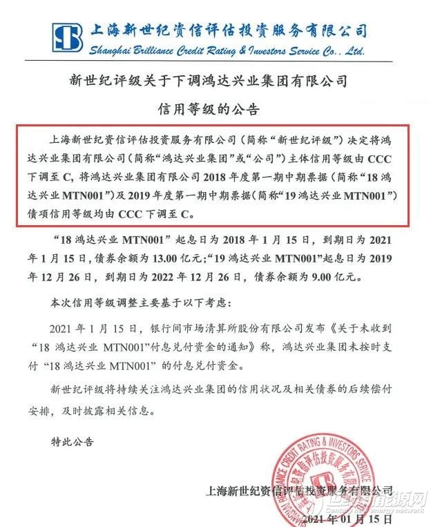 受此影響,上海新世紀(jì)資信評估投資服務(wù)有限公司于1月14日和1月19日兩次下調(diào)鴻達(dá)興業(yè)集團(tuán)主體的債項信用等級,由BB降至C。根據(jù)新世紀(jì)評級官網(wǎng)給出的等級定義,C級屬于“投機(jī)級”,意為“不能償還債務(wù)”。