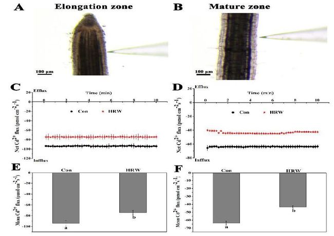 圖1. 50 μM Cd處理下HRW預(yù)處理對(duì)小白菜根部伸長(zhǎng)區(qū)(A, C, E)和成熟區(qū)(B, D, F)Cd2+流速的影響