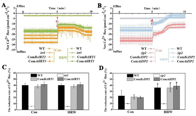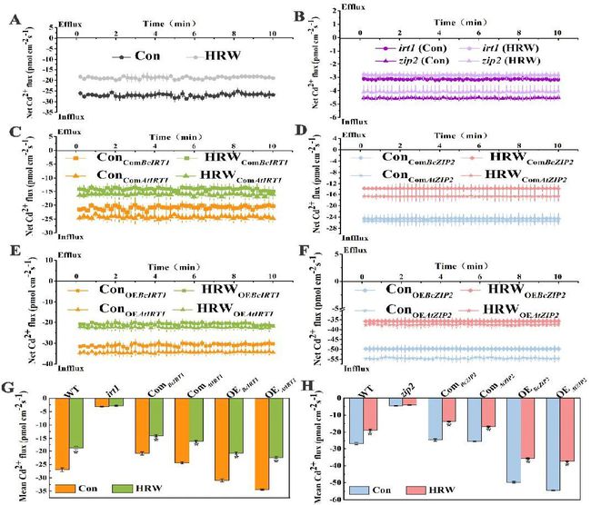通過(guò)Cd(鎘)濃度,Cd2+熒光染色,NMT(非損傷微測(cè)技術(shù))對(duì)Cd吸收進(jìn)行分析,結(jié)果表明,HRW(hydrogen-rich water,富氫水)在降低小白菜幼苗根部對(duì)Cd的吸收方面具有顯著的積極作用。BcIRT1(鐵調(diào)節(jié)轉(zhuǎn)運(yùn)蛋白1)和BcZIP2(鋅調(diào)節(jié)轉(zhuǎn)運(yùn)蛋白2)是小白菜中主要的Cd轉(zhuǎn)運(yùn)蛋白,但它們?cè)贖RW減少Cd吸收過(guò)程中的作用仍然未知。本研究驗(yàn)證了IRT1和ZIP2在白菜和擬南芥中HRW減少Cd吸收中的功能。在擬南芥中的異源和同源表達(dá)表明,HRW顯著降低了野生型(Col-0)和轉(zhuǎn)基因擬南芥IRT1和ZIP2中的Cd含量,但irt1和zip2突變體除外。NMT檢測(cè)表明,HRW不僅降低了Cd2+在WT和轉(zhuǎn)基因株系根部的內(nèi)流,而且增強(qiáng)了Zn和Cd之間的競(jìng)爭(zhēng)。綜合來(lái)看,HRW誘導(dǎo)的植物Cd積累減少可能是通過(guò)抑制BcIRT1和BcZIP2的表達(dá),影響B(tài)cIRT1和BcZIP2對(duì)離子吸收的偏好性導(dǎo)致的。