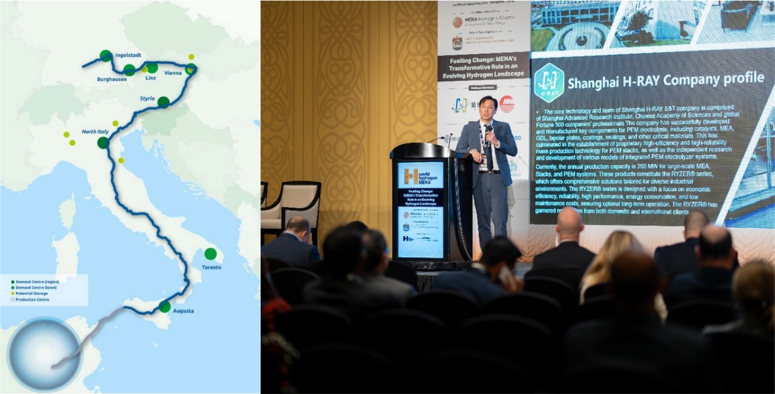 會(huì)議中,多位專家學(xué)者做出精彩發(fā)言,Dr.Christopher 分享了未來中東綠氫成本構(gòu)成和能源轉(zhuǎn)型的全要素,IRE Dr. Samir 分享了綠氫發(fā)展中的創(chuàng)新及摩洛哥在中東綠氫中心的貢獻(xiàn),Dr. Kapil.Narula 分享了中東氫能政策及關(guān)鍵變化和認(rèn)證。Dr.Assem 分享了GW級(jí)綠氫項(xiàng)目成功的關(guān)鍵,多位專家提供了中東綠色氫能發(fā)展的成功案例和目前遇到的障礙,也分享了如何破除障礙,其中,關(guān)于綠氫生產(chǎn)后,經(jīng)過中東各國(guó)到北非,再到意大利最終到歐洲的大型輸氫主管網(wǎng)項(xiàng)目將是目前進(jìn)展的關(guān)鍵,對(duì)于擁有幾個(gè)GW級(jí)項(xiàng)目的阿聯(lián)酋、沙特、摩納哥及北非地區(qū)都在積極規(guī)劃并參與到輸氫主干管網(wǎng)中。來自上海氫銳科技的胡大麟介紹了《高效的PEM電解水技術(shù)及綠電制綠氫的整體解決方案》。