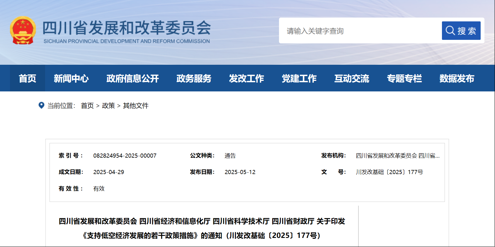5月12日,四川省發展和改革委員會、四川省經濟和信息化廳、四川省科學技術廳與四川省財政廳聯合印發《支持低空經濟發展的若干政策措施》。