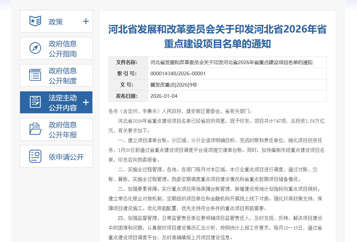 [ 導(dǎo)讀 ]近日,河北、山西、江蘇、四川先后公布2026年重點項目名單。○ 河北省1月4日,河北省發(fā)展和改革委員會發(fā)布河北省2026年省重點建設(shè)...