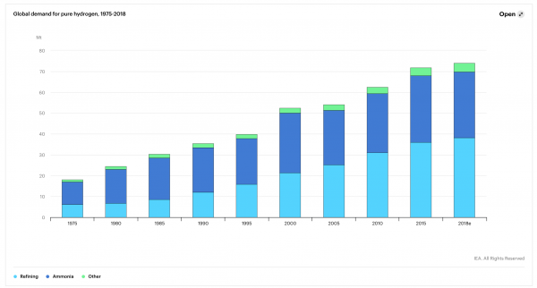 國際能源署(IEA)成立于1974年,目的是確保石油供應(yīng)安全。該機(jī)構(gòu)對(duì)能源轉(zhuǎn)型的預(yù)測(cè)記錄不佳,但從歷史統(tǒng)計(jì)數(shù)據(jù)來看,它非常可靠。在2019年的《未來的氫》報(bào)告中,國際能源署透露了清潔、綠色氫的一個(gè)小秘密:目前大部分氫用于石油工業(yè)的煉油廠,這是過去30年市場增長的主要來源。