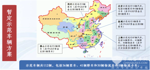 2016年8月31日,由全球環境基金(GEF)、聯合國開發計劃署(UNDP)支持,科技部、財政部聯合北京市、上海市、河南省、廣東省和江蘇省政府共同實施的“促進中國燃料電池汽車商業化發展”項目正式啟動(簡稱GEF三期),分別在北京、上海、佛山、鄭州、鹽城等國內5個城市,示范運行推廣112輛燃料電池汽車,其中包括36輛客車、41輛轎車、30輛物流車和5輛物流卡車。