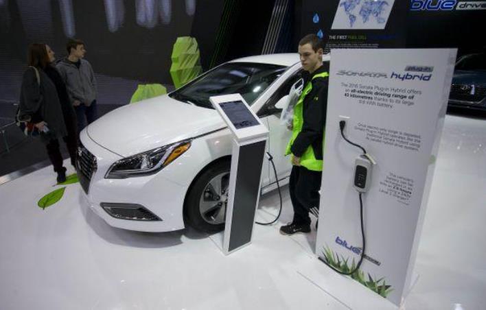 資料圖:在加拿大多倫多,觀眾在車展上參觀一輛現代索納塔插電式混合動力車。(新華社)