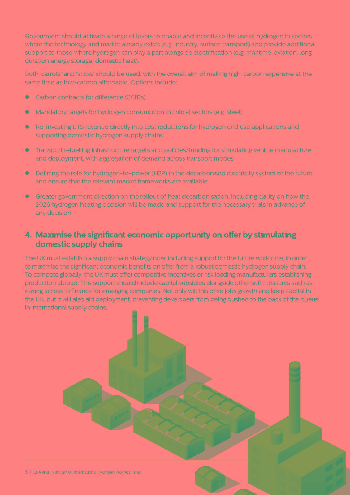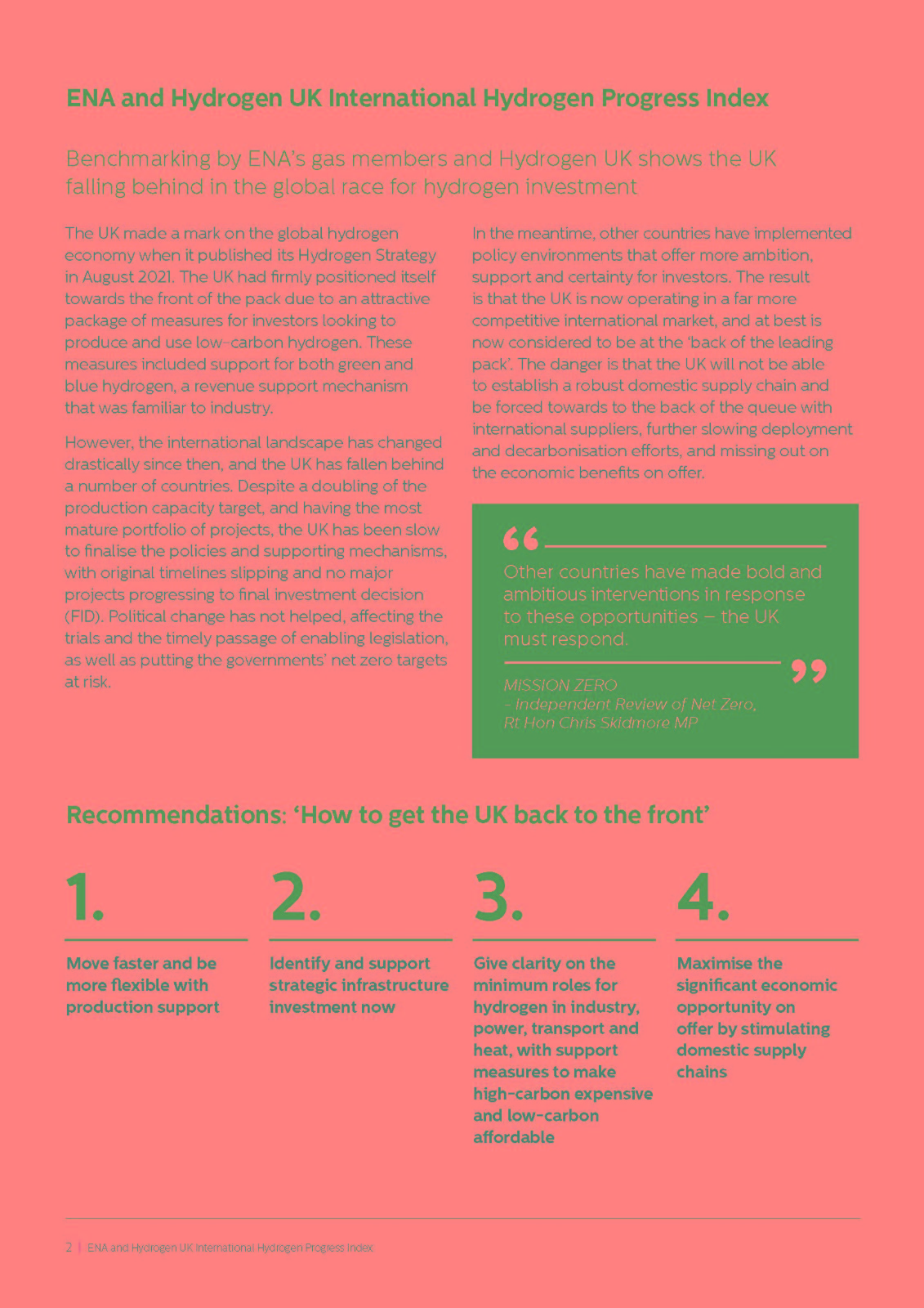 報告指出:“危險在于,英國將無法建立健全的國內供應鏈,被迫排在國際供應商的后面,從而進一步減緩部署和脫碳努力,錯失由此帶來的經濟效益?!盓NA和Hydrogen UK的成員建議英國在生產支持方面采取更快、更靈活的行動,并表示:“作為一項緊急事項,政府應該通過《能源法案》,制定可投資的生產商業模式,并建立適當的收入增加機制?!?/span>