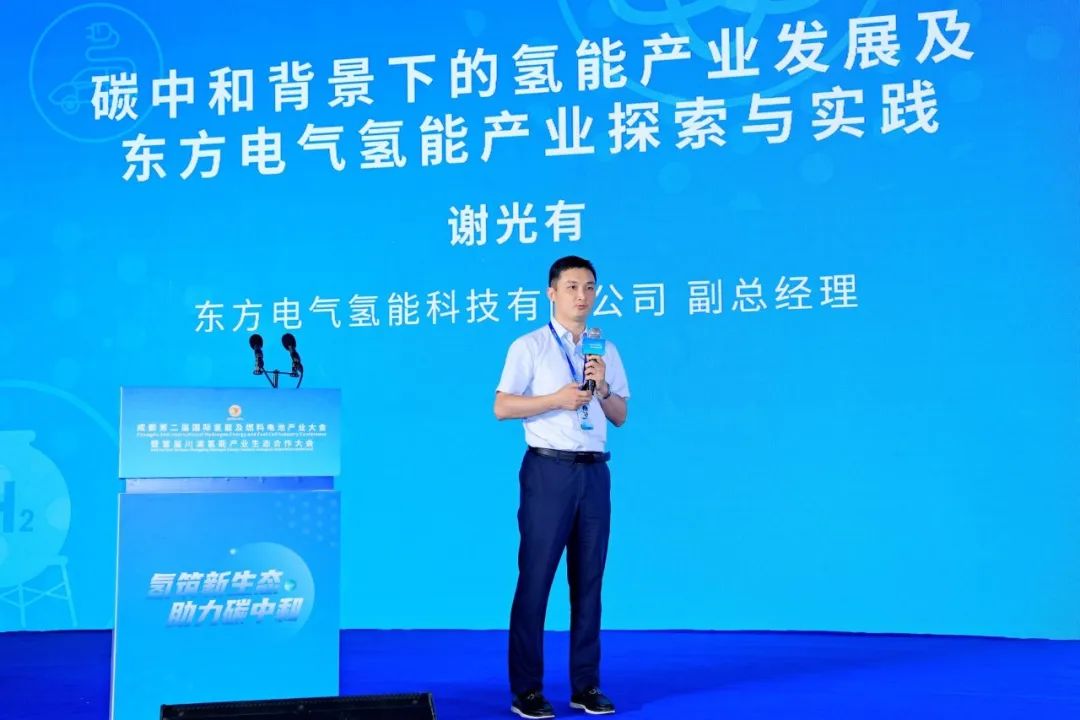 東方電氣作為氫能及燃料電池產業的領軍企業,近年來不僅致力于搭建行業交流平臺,凝聚各方力量,推動氫能產業高質量發展,還積極協助四川省、成都市等地制定氫能產業規劃,助力成渝城市群打造氫能產業高地。在本次會議上,東方電氣氫能科技有限公司副總經理謝光有從碳中和背景與產業前景、東方電氣氫能產業布局和東方電氣氫能產業實踐三個方面介紹了東方電氣氫能產業發展的實踐經驗和成果。
