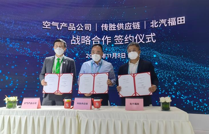11月8日,風(fēng)頭正勁的氫燃料電池車領(lǐng)域在進博會上迎來一樁喜訊,在空氣產(chǎn)品公司展臺,傳勝供應(yīng)鏈管理(上海)有限公司(以下簡稱“傳勝供應(yīng)”)、北汽福田汽車股份有限公司(以下簡稱“福田汽車”)、空氣化工產(chǎn)品(中國)投資有限公司(以下簡稱“空氣化工產(chǎn)品投資”)三方,分別作為甲乙丙方,簽署了戰(zhàn)略合作協(xié)議。
