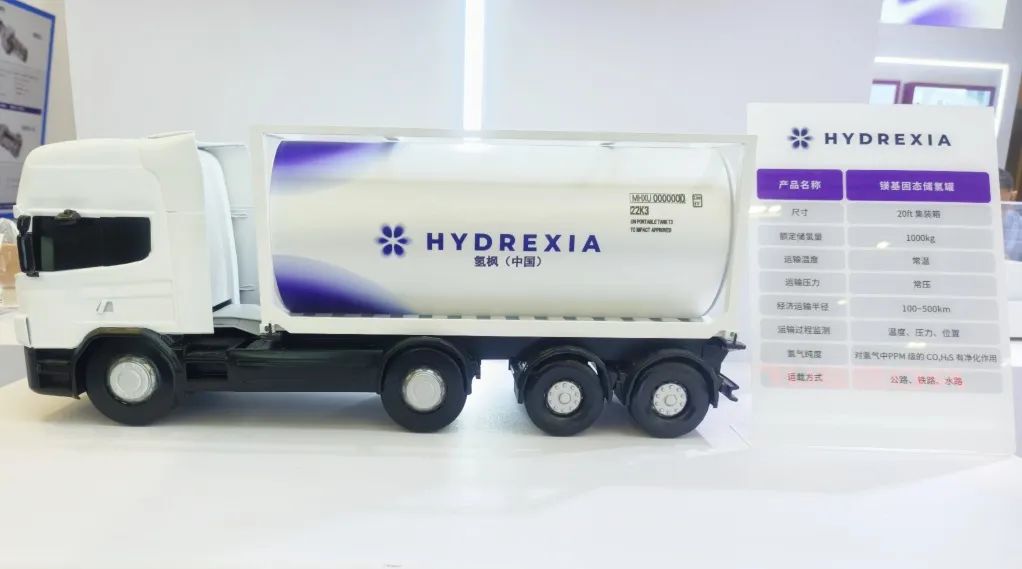 我們自主研發的業內突破性鎂基固態儲運氫技術,以高密度、常溫常壓的突出優勢為氫氣儲運提供更為高效的解決方案。現場展示的鎂基固態儲運氫車(模型)為氫楓今年10月份交付的首批儲運氫產品。我們的儲氫罐采用標準集裝箱設計,單罐儲氫量為1t~1.5t,具有增強的安全性、更大的儲氫容量、更高的氫氣純度、更節約的運輸成本、更長的使用壽命等優勢,未來在耦合可再生能源儲能、氫化工、氫冶金等領域展現出強大的應用潛力。