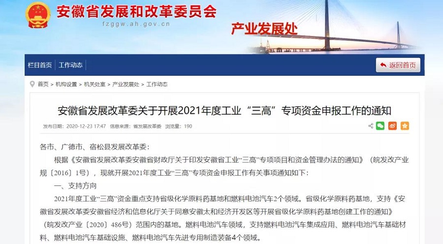 [ 導讀 ]合肥發改委公示信息顯示,近日,合肥市發改委正式對外發布關于開展2021年度省工業“三高”項目申報工作的通知,支持燃料電池汽車...