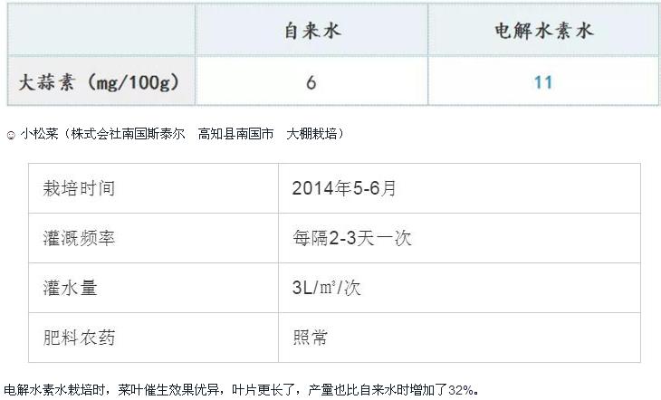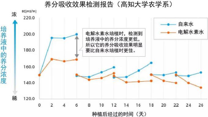 分別用自來水和電解水素水調制培養液,在栽培小松菜時,觀察到電解水素水的栽培期間的EC(培養液中養分濃度的指標)比自來水低了不少。這可以說明在使用電解水素水時養分的吸收更加充分。