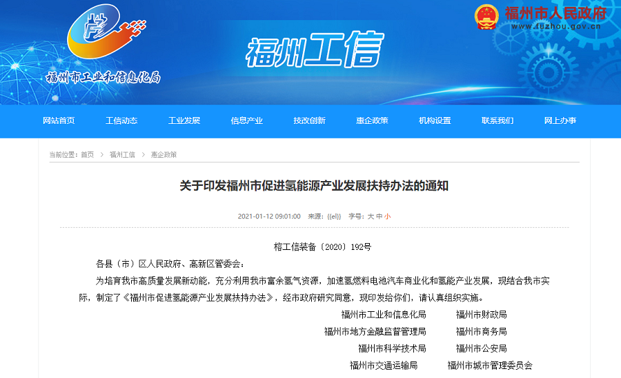 圖1《福州市促進氫能源產業發展扶持辦法》通知