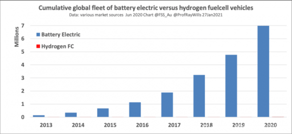 這正是Wills認(rèn)為鋰電池會發(fā)生的事情,讓氫氣步其后塵。他說:“氫氣作為交通燃料,比起鋰電池還差得很遠(yuǎn)。”如今,全球電動汽車的數(shù)量據(jù)信已超過1000萬輛。根據(jù)電動汽車銷售世界數(shù)據(jù)庫EV Volumes的數(shù)據(jù),電池電動汽車(BEV)和插電式混合動力汽車(PHEV)的銷量從2019年的226萬輛上升到2020年的324萬輛。
