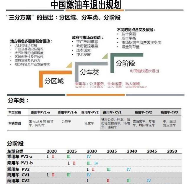 中國也規劃出了自己的燃油車退出方案,提出了分區域、分車類、分階段的“三分方案”,最早的出租車于2020年退出,最遲的CV2商用車2045年退出,其中最受大家關注的私家乘用車,要在2030年退出。