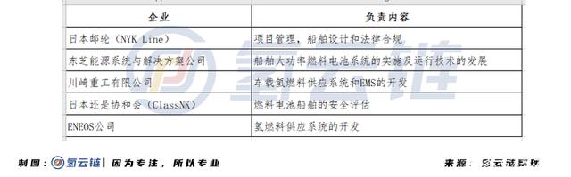 以日本游輪NYK Line項目為例,NYK Line將管理整個項目,同時協助船舶設計和法律合規;東芝將在船上安裝大功率燃料電池系統并開發操作技術;川崎重工將負責開發船上的氫氣供應系統和能源管理系統;Eneos負責開發氫燃料供應體系(該公司的前身為JXTG);日本船級社ClassNK將合作對已開發船只的安全性進行評估。