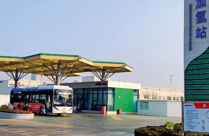 (在山東濰坊市濰柴加氫站內(nèi)加氫的公交車。圖/濰柴動力)