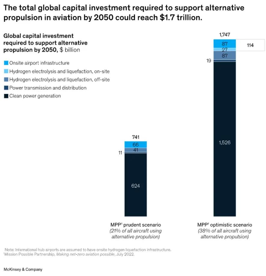 替代動力需要兩個新的基礎設施價值鏈。其中一個涉及電池電動航空,另一個是氫能航空。