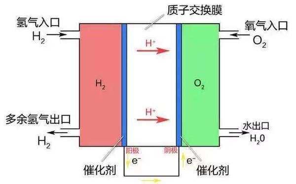 氫燃料電池汽車的工作原理其實很簡單,說的直白一些就是電解水的逆反應(yīng)。氫燃料電池的結(jié)構(gòu)上有兩塊電極,分別是氫電極和空氣電極(空氣電極主要是需要空氣中的氧氣),在氫電極上供給足夠的氫氣,氫氣在氫電極上被電離生成正1價氫離子(H+),同時空氣電極上提供足夠多的空氣,空氣中的氧氣在電極上被電離生成負2價氧離子(O2—)。在這個過程中,2個氫氣分子(4個氫原子)失去4個電子(4e)變成4 H+,1個氧氣分子(2個氧原子)得到4個電子(4e)變成2O2—,氫離子與氧離子結(jié)合后生成水。化學(xué)反應(yīng)方程式為: