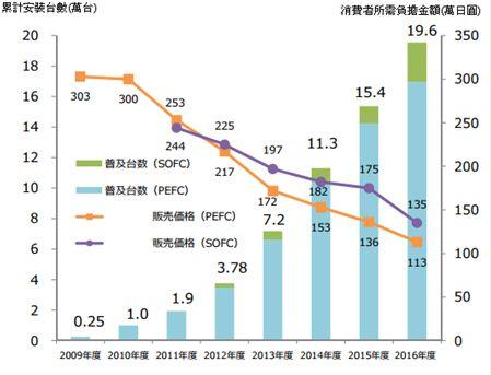 在2009年產(chǎn)品推廣前夕,日本政府同意每套燃料電池補(bǔ)貼140萬日元或者制造成本的一半,并做出補(bǔ)貼多年的承諾。雖然每套設(shè)備的補(bǔ)貼力度下降,但是總的補(bǔ)貼預(yù)算不斷升高。在2009年大約安裝了2300套燃料電池設(shè)備,現(xiàn)在這個(gè)數(shù)字已經(jīng)慢慢增長(zhǎng)至超過12000套,而每套設(shè)備的補(bǔ)貼則降至了500000至600000日元。而從2012年開始銷售量差不多翻倍。2015年ENE-FARM的補(bǔ)貼金額達(dá)到了222億日元,這一輪補(bǔ)貼到2016年年底已經(jīng)結(jié)束。