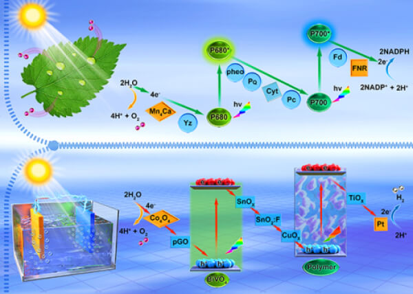 研究中,團(tuán)隊(duì)基于自然光合作用的原理,采用多介質(zhì)調(diào)控策略,以自然光合作用Z機(jī)制為靈感,實(shí)現(xiàn)高效光電催化全分解水過(guò)程,該團(tuán)隊(duì)通過(guò)將無(wú)機(jī)氧化物基光陽(yáng)極 (BiVO4) 和有機(jī)聚合物基光電陰極 (PBDB-T:ITIC:PC71BM) 與多種電荷傳輸介質(zhì)耦合,組裝了一種高效的無(wú)偏全分離水光電化學(xué)池。研究發(fā)現(xiàn),體系中有機(jī)聚合物的離散能級(jí)特性,使得有機(jī)光電陰極和無(wú)機(jī)光電陽(yáng)極的光譜吸收具有很好的互補(bǔ)性,大大提高了太陽(yáng)能的利用率。此外,該系統(tǒng)在光收集材料和電子受體/供體之間構(gòu)建了包含多種電荷傳輸介質(zhì)的仿生電荷傳輸鏈。在電化學(xué)勢(shì)梯度的驅(qū)動(dòng)下,光生電子通過(guò)這些電荷傳輸介質(zhì)有效轉(zhuǎn)移,提高了電荷轉(zhuǎn)移率,降低了電荷復(fù)合率,實(shí)現(xiàn)了高效的電荷分離和轉(zhuǎn)移。結(jié)果,太陽(yáng)能-氫(STH)轉(zhuǎn)換效率達(dá)到4.3%。該研究通過(guò)使用具有匹配能級(jí)的多媒體調(diào)控的仿生策略,為高效人工光合系統(tǒng)的合理設(shè)計(jì)和組裝提供了新的思路和有效的方法。