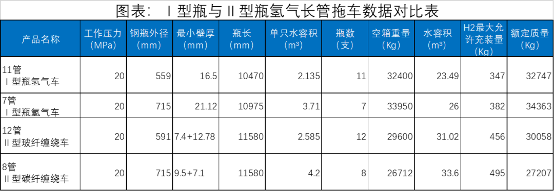 目前在國內使用的長管拖車上常安裝6~12支大容積無縫鋼膽氣瓶,瓶型主要為Ⅰ型瓶和Ⅱ型瓶。Ⅰ型瓶的瓶體為全鋼質無縫大容積氣瓶,單瓶容積可達3700升。Ⅱ型瓶組成的長管拖車瓶體為鋼質無縫大容積氣瓶內膽外部環向纏繞玻璃纖維或碳纖維結構,單瓶容積最高可達4200升。長管拖車的運輸效率和運輸經濟性取決于其可裝載的氫氣量。目前國內常規的氫氣長管拖車工作壓力主要為20MPa,長管拖車的主要規格及可裝載的氫氣量參見下表。