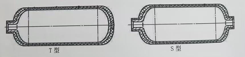 Ⅲ型氫氣瓶按結構形式可分為T型瓶和S型瓶。T型瓶為單瓶口、凸形底結構,S型瓶為兩端開口結構。如下圖所示: