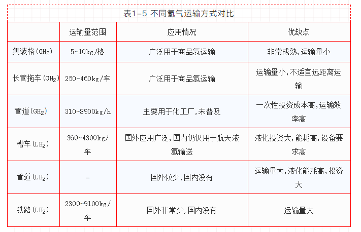 高壓氫氣運輸一般采用集裝格?長管拖車和管道傳輸,而液氫一般采用槽車?鐵路等運輸,短途也會采用管道運輸?不同氫氣運輸方式對比詳見表1-5?