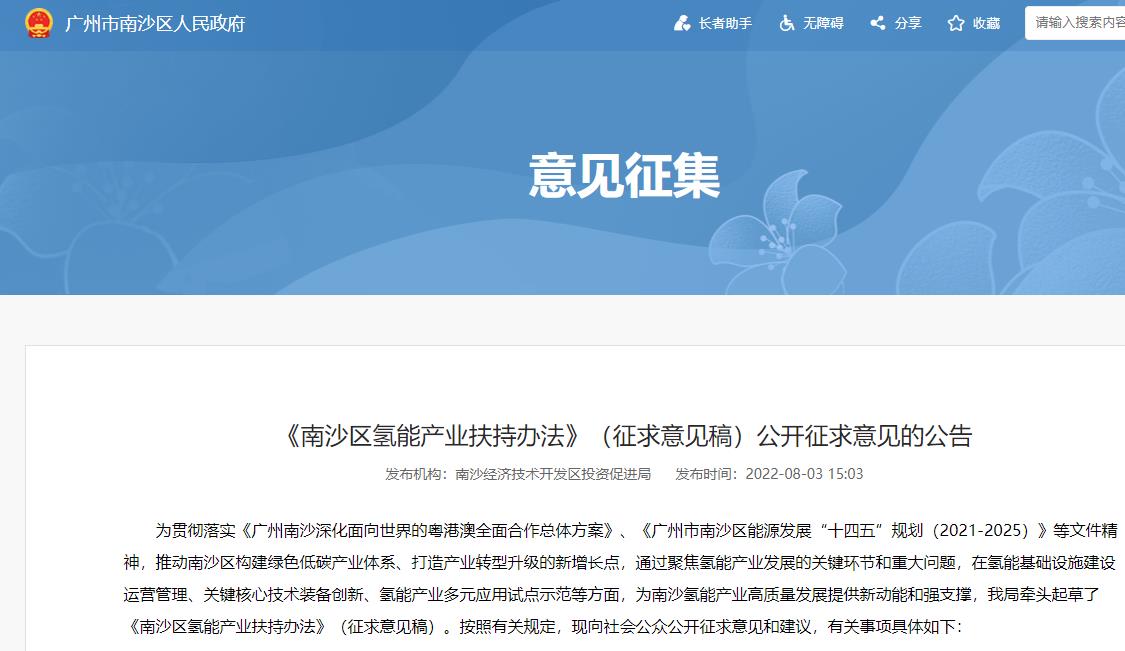 氫啟未來網(wǎng)獲悉,8月3日,廣州市南沙區(qū)人民政府在其官網(wǎng)發(fā)布《南沙區(qū)氫能產(chǎn)業(yè)扶持辦法》(征求意見稿)公開征求意見的公告!原文內(nèi)容如下: