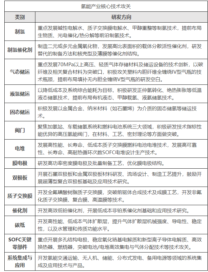 1.加快核心關鍵技術研發。以產業化為導向,推動核心技術的關鍵性能提升與綜合成本降低,實現核心技術與產品的自主可控。鼓勵創新多元化制氫工藝方式,重點發展高效率、長壽命、低成本的質子交換膜電解水、甲醇重整等制氫技術,提前布局生物質、光電催化/熱分解等前沿制氫技術。重點發展70MPa以上高壓、輕質氣體存儲材料及儲運設備的技術創新,提前布局以液態化合物為介質的液態儲氫和以合金、納米材料為介質的固態儲氫等儲運技術。重點開展高性能和低成本的質子交換膜、膜電極、碳紙、催化劑等燃料電池關鍵材料和核心零部件的技術創新,實現燃料電池系統關鍵性能指標達到國內領先水平,綜合成本顯著降低。