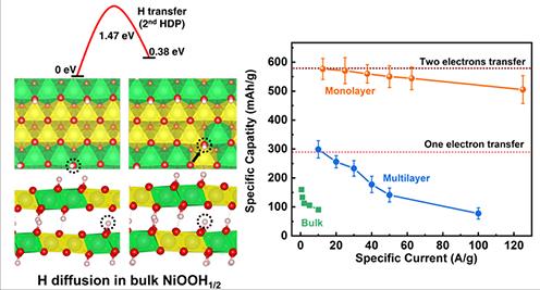 過渡金屬氧化物和氫氧化物由于具有高理論容量、寬電壓范圍和良好的電化學穩定性,是典型的重要儲能材料之一。以氫氧化鎳為例,其儲能依賴于氫原子吸脫附過程中的電子轉移。雖然氫氧化鎳材料在電催化過程中的原子結構演化和電子轉移已經在理論和實驗上得到了廣泛的探索,然而其在能量存儲方面的性能還未達到雙電子轉移的理論極限。相比于傳統的多層氫氧化鎳材料在儲能過程中的單電子轉移,團隊報道了在單層氫氧化鎳納米片儲能過程中發現的雙電子轉移。第一性原理計算表明,在多層氫氧化物材料中容易發生Ni2+轉變為Ni3+的第一步脫氫過程,但隨后到Ni4+的第二步脫氫卻受到層間氫鍵和由Ni3+離子中心八面體姜泰勒效應(Jahn-Teller)畸變引起的域結構的強烈阻礙。在單分子層中由于所有的氫原子都暴露在表面,它容易脫附所有的氫原子而實現雙電子轉移。儲能實驗結果表明,制備的單層氫氧化鎳可以實現兩個電子轉移,使大部分的Ni離子在充電過程中轉化為Ni4+,展示出576 mAh/g的氧化還原容量,近乎單電子過程理論容量的兩倍(圖)。
