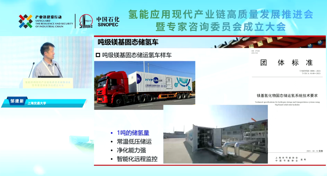 在會(huì)議的中央企業(yè)產(chǎn)業(yè)鏈沙龍環(huán)節(jié),氫楓能源首席科學(xué)家、上海交通大學(xué)氫科學(xué)中心副主任鄒建新教授與在場領(lǐng)導(dǎo)及專家們交流了高容量鎂基固態(tài)儲(chǔ)運(yùn)氫技術(shù)進(jìn)展。目前,氫楓能源聯(lián)合上海交通大學(xué)氫科學(xué)中心已成功實(shí)現(xiàn)該技術(shù)的實(shí)際落地,研發(fā)生產(chǎn)的第一代鎂基固態(tài)儲(chǔ)運(yùn)氫車(MH-100T)單車儲(chǔ)氫量可達(dá)1噸,為氫能的大規(guī)模多場景應(yīng)用創(chuàng)造了更多可能性。同時(shí),氫楓還在進(jìn)一步研發(fā)適配小場景用氫需求的鎂基固態(tài)儲(chǔ)氫單體,通過可自由擴(kuò)展組合的小型儲(chǔ)氫單元,拓展備用電源、分布式儲(chǔ)能等應(yīng)用場景。