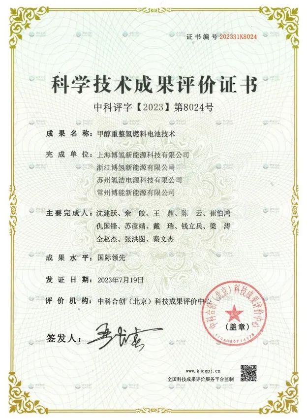 專家委員會一致認為:博氫新能源“甲醇重整氫燃料電池技術”項目通過科技成果評價,認定為“國際領先水平”。