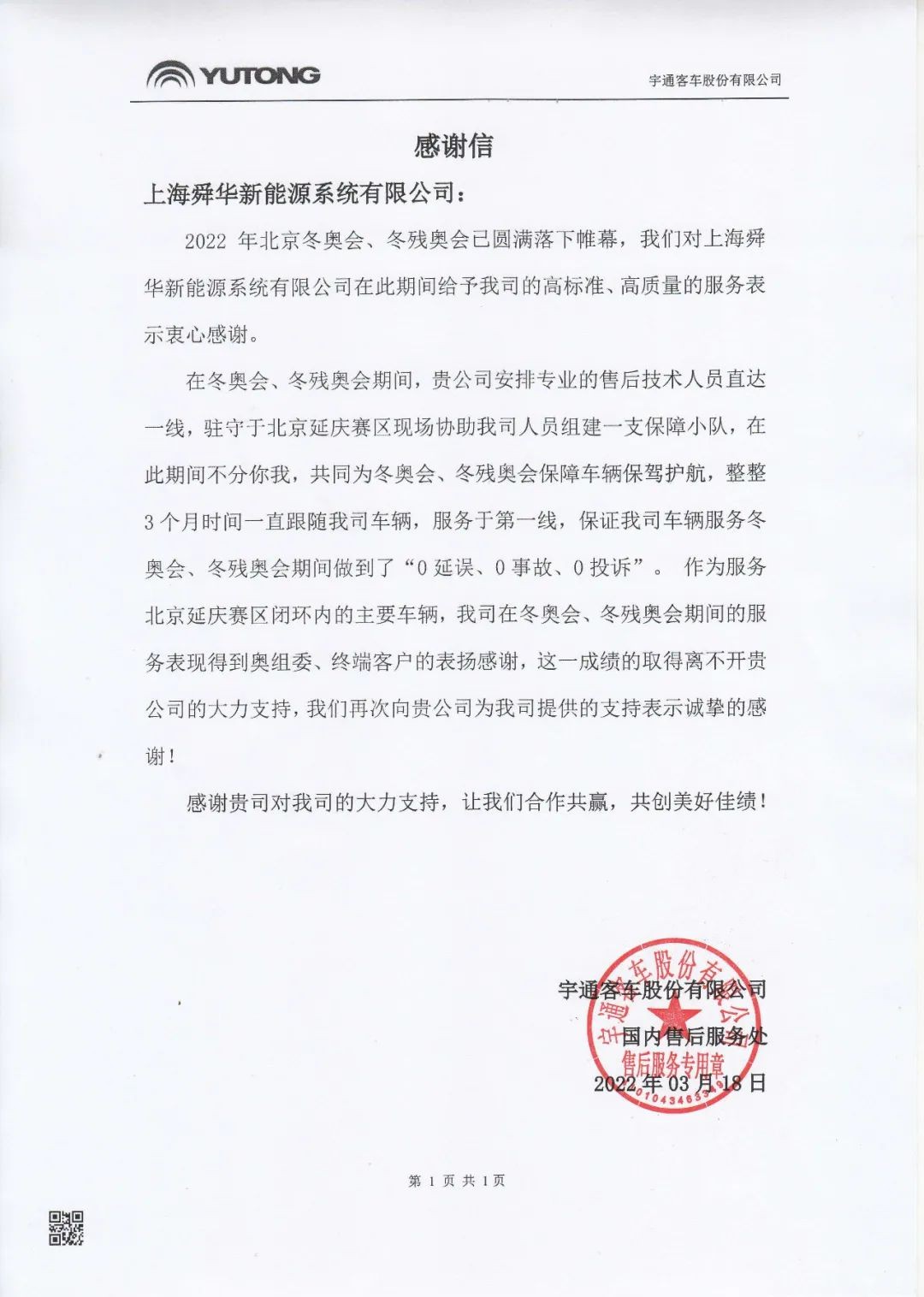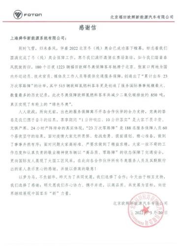 冬奧會后我們陸續(xù)收到來自多家客戶的感謝信,上海舜華新能源系統(tǒng)有限公司保供專班服務(wù)人員技術(shù)專業(yè)、快速響應(yīng)、高效服務(wù),圓滿地完成了賽事保障工作,贏得了客戶的認(rèn)可。