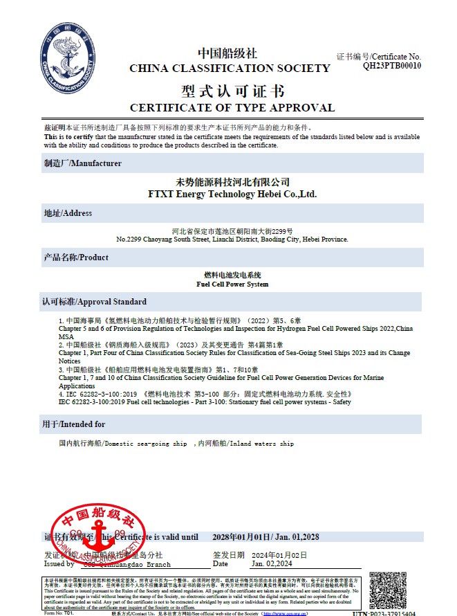 經過中國船級社(CCS)嚴格的審核,確認該產品完全符合中國海事局《氫燃料電池動力船舶技術與檢驗暫行規則》及中國船級社《鋼質海船入級規范》、《船舶應用燃料電池發電裝置指南》等相關標準要求。