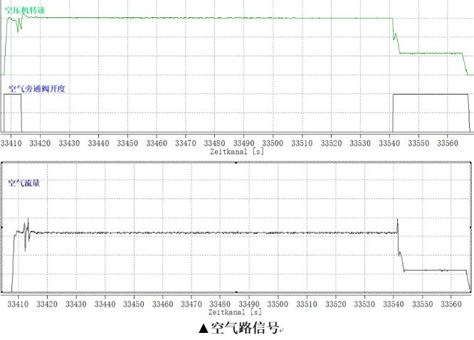 數據顯示,在車輛喚醒后進行了3個階段的吹掃,分別是管路-電堆-管路,且每個階段的空氣流量都不同,其中電堆內的吹掃時間最長,占比77%,吹掃完電堆后對管路進行了一個簡短且較低流量的吹掃。