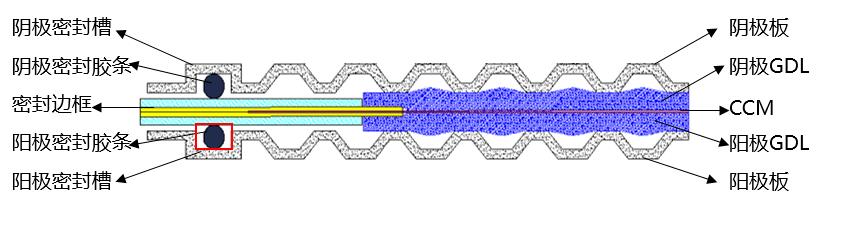 想要實現大功率電堆做到零泄漏,必須先清楚電堆單電池如何實現密封。如下圖所示,單電池的結構基本為兩片雙極板與一片MEA,從微觀層面判斷,燃料電池密封的類型為傳統的軸向靜密封,在氣體工作壓力的作用下,密封膠具有向電堆外側移動的趨勢,為防止密封膠的移動,依靠密封膠受壓接觸面上的摩擦力,防止燃料氣體泄露。
